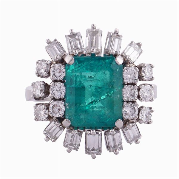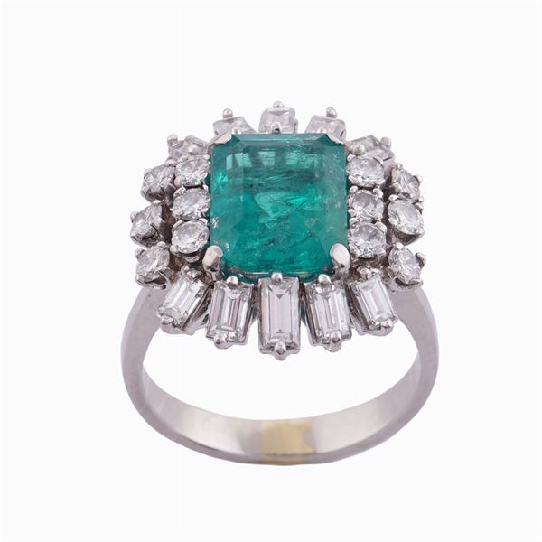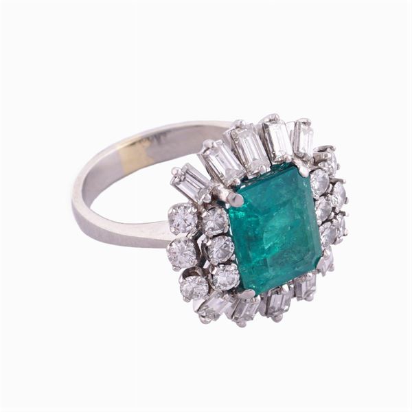 taglio smeraldo ct 4 circa contornato da diamanti taglio brillante baguettes ct 1,40 circa, misura 12, peso 7,9 gr.