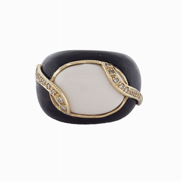 centrato da un corallo bianco - rosa taglio cabochon e ai lati diamanti taglio huit - huit, misura 13, peso 18,1 gr.
