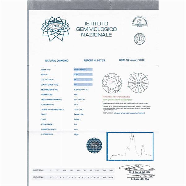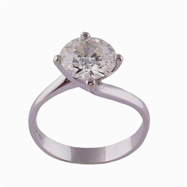 circa colore M - purezza SI1, misura 15, montato in oro bianco 18kt, completo di certificato gemmologico I.G.N. n. 26753, peso 3,9 gr.