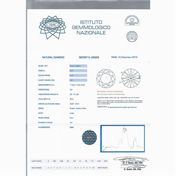 taglio brillante, colore N/O - purezza VS1, misura 12, completo di certificato gemmologico I.G.N. n. 26659, peso 3,8 gr.