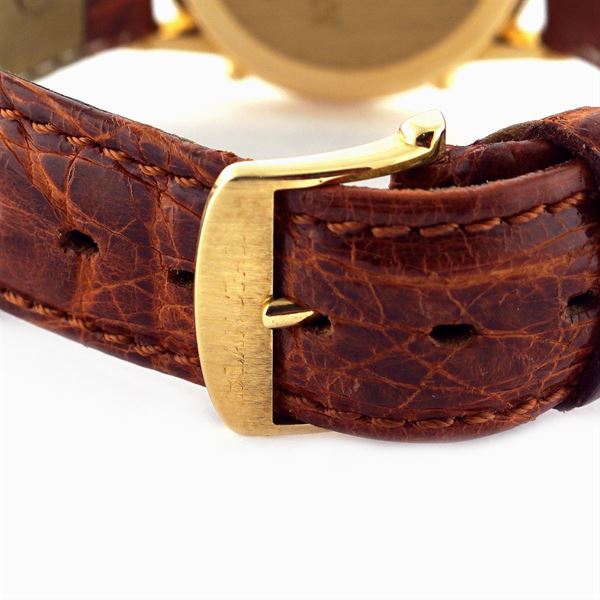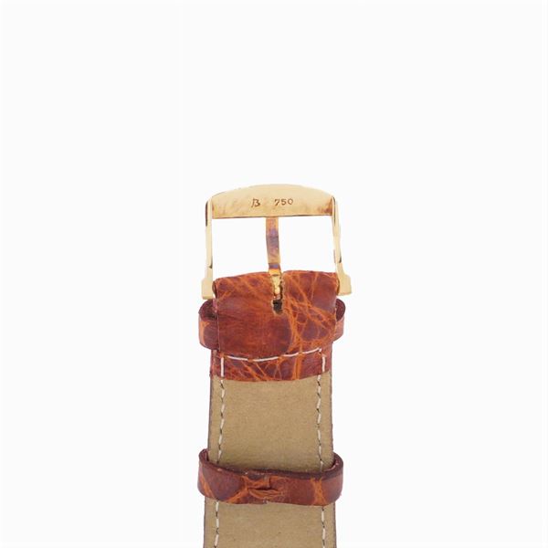 in oro giallo 18kt, cassa tonda 33 mm. - ref. 2776, quadrante bianco con numeri romani, calendario completo con i giorni del mese, della settimana, i mesi e fasi lunari, movimento meccanico a carica automatica, cinturino in pelle con fibbia originale in oro giallo 18kt