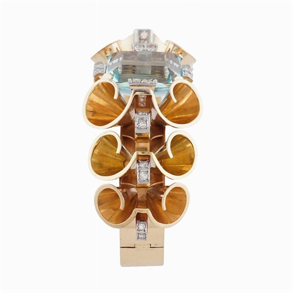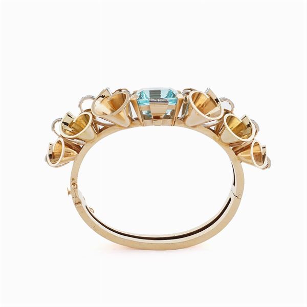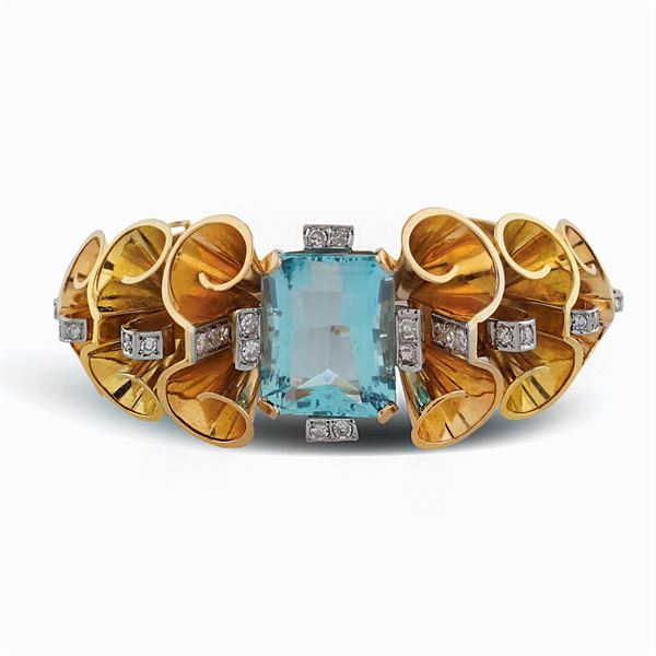 centrato da un'acquamarina taglio rettangolare a gradini ct 25 circa e diamanti taglio brillante antico ct 1,20 circa incastonati su oro bianco, chiusura a scomparsa, diametro 6 cm., peso 72,4 gr.