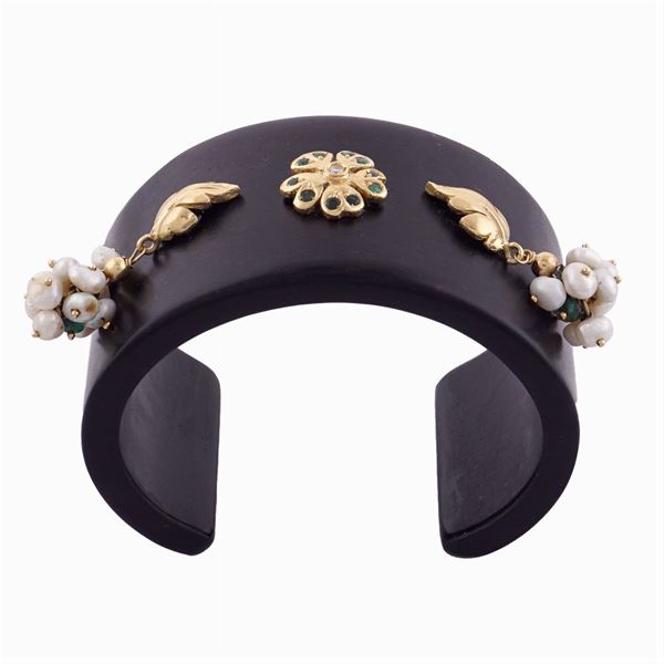 impreziosito da elementi in oro giallo 18kt, smeraldi, diamanti fancy yellow e grappoli pendenti in oro perline e smeraldi a sfera, diametro 6 cm., peso 50 gr.