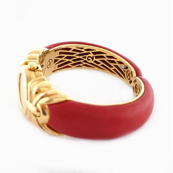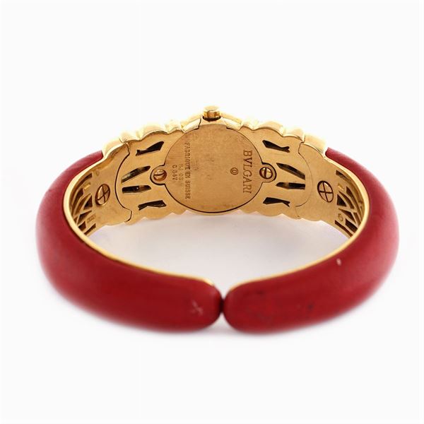in oro giallo 18kt, cassa tonda 20 mm. - BJ03 - C347, quadrante bianco, vetro zaffiro, movimento al quarzo, bracciale originale a manetta in oro giallo e pelle nella tonalità del rosso, peso 77 gr.