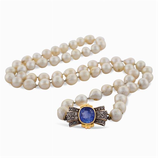 forma irregolare 8,5 mm. circa, centrale a forma di fiocco in oro e argento con zaffiro ovale taglio briolet ct 3 circa, ai lati rose di diamante, lunghezza 58 cm. lievi difetti, peso 61 gr.