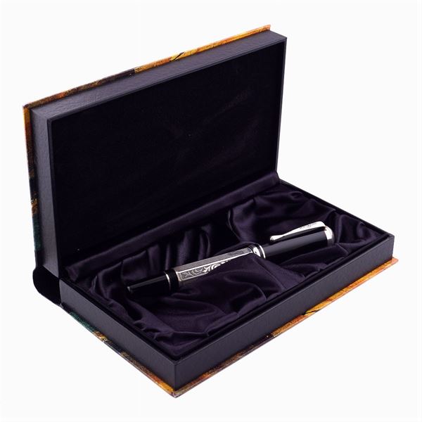 penna stilografica in argento inciso e lacca nera, il pennino in oro bianco 18kt ha incisa una clessidra in omaggio alla più nota opera di Proust, firmata e numerata n. 4810, firma dello scrittore incisa sul corpo della penna, completa di scatola originale e documenti, l. 13,5 cm.