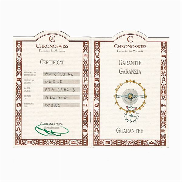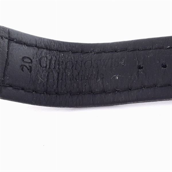 in acciaio, cassa tonda 40 mm - n. 04060, ghiera girevole, quadrante nero con indici e numeri arabi, datario ore 6, ref. CH2833, vetro zaffiro, movimento meccanico a carica automatica a vista, calibro eta 2892-2, cinturino originale in pelle con fibbia in acciaio, completo di scatola originale e garanzia.