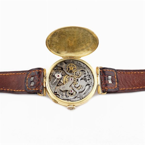 bicompax monopulsante, in oro giallo 18kt, doppia cassa tonda 40 mm. - ref. 219309, lievi difetti, quadrante in porcellana con numeri arabi, due contatori ausiliari per il cronografo, scala tachimetrica e telemetrica, movimento Landeron meccanico a carica manuale, cinturino in pelle con fibbia in metallo dorato