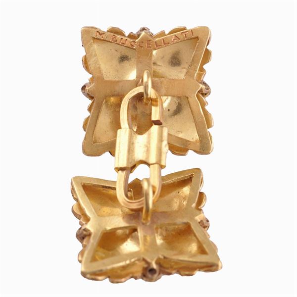 realizzati in oro rosa e giallo interamente inciso e cesellato a motivo di foglie, al centro quattro zaffiri taglio cabochon, firmati M. Buccellati sul retro, peso 19,2 gr.