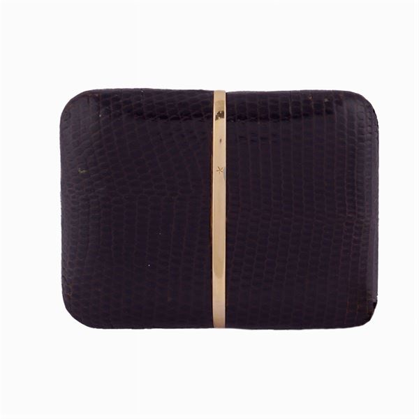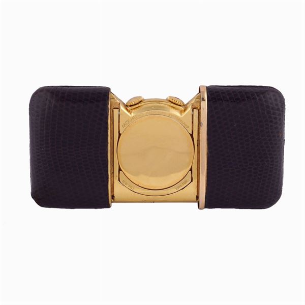 in metallo dorato e pelle, cassa quadrata 3x3 mm. a scomparsa,  quadrante argentato con indici dorati e numeri arabi, movimento meccanico a carica manuale, calibro movado, completo di catena orologio in oro giallo 9 kt, peso lordo 102 gr.