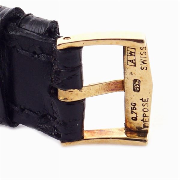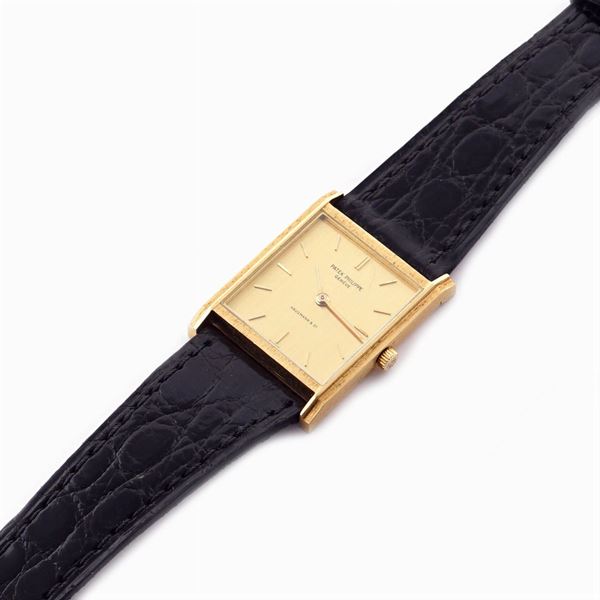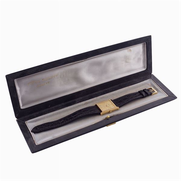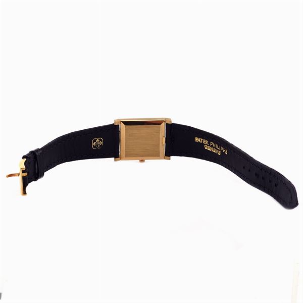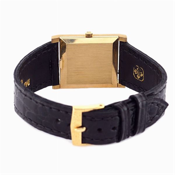 in oro giallo 18kt, ref. 3519 - n. 2670766, cassa rettangolare 33x25 mm., quadrante dorato con indici, movimento meccanico a carica manuale, calibro 23-300, cinturino con fibbia originali in pelle e in oro giallo 18kt, completo di scatola orginale