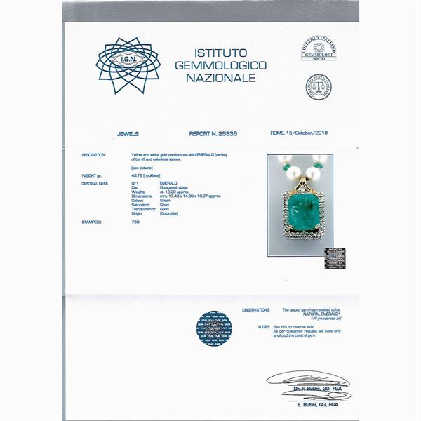 montato in oro giallo e bianco 18kt e contornato da diamanti taglio brillante ct 1,50 circa; completo di collana di perle coltivate 7 mm. circa alternate ad elementi in oro giallo e smeraldi taglio briolet, chiusura a scomparsa,