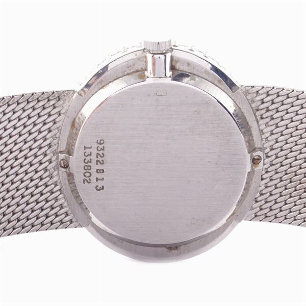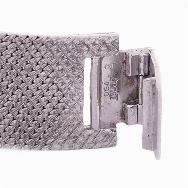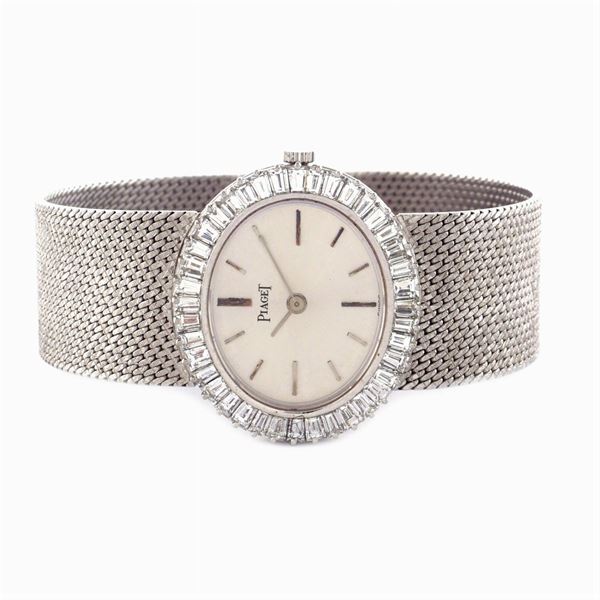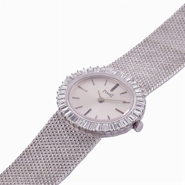 in oro bianco 18 kt, cassa ovale 29x27 mm. - ref. 9322 B 1 3 - 133802, ghiera con diamanti taglio baguette ct 2 circa, quadrante argentato con indici, movimento meccanico a carica manuale ref. 668550, calibro Piaget 9P,  bracciale originale in oro bianco 18kt a tessuto con chiusura a cofanetto in oro bianco 18kt, lunghezza 16, 5 cm., peso 53,5 gr.
