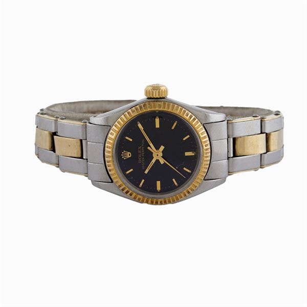 in acciaio e oro giallo, cassa tonda 25 mm. - ref. 6804, ghiera zigrinata, quadrante nero con indici dorati, movimento meccanico a carica automatica, calibro 1161, bracciale originale oyster in acciaio e oro giallo
