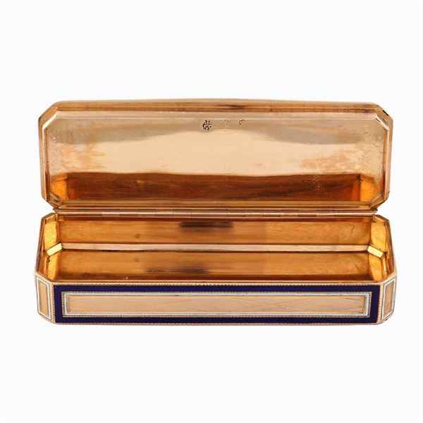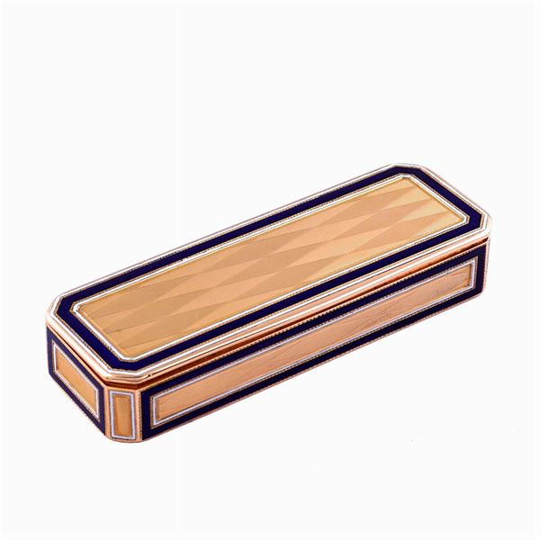 forma rettangolare, superficie decorata con motivi geometrici e stesura in smalto guilloché blu e bianco, 1,5x9x3,2 cm., peso 77,7 gr.