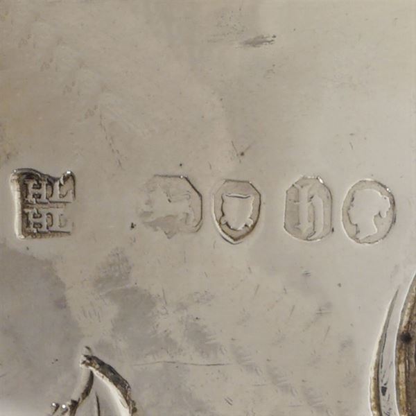 orafo Henry John Lias & Henry John Lias, base circolare, corpo sbalzato e decorato a scena campestre con bambini e motivi floreali, dedica entro cartiglio, manico a doppia voluta con terminale a ricciolo, interno in vermeil, h. 13 cm., peso 204 gr.