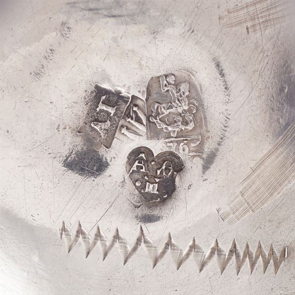 orafo Alexei Polozov, corpo piriforme sbalzato e cesellato con motivi vegetali, manico di linea sagomata in legno,
