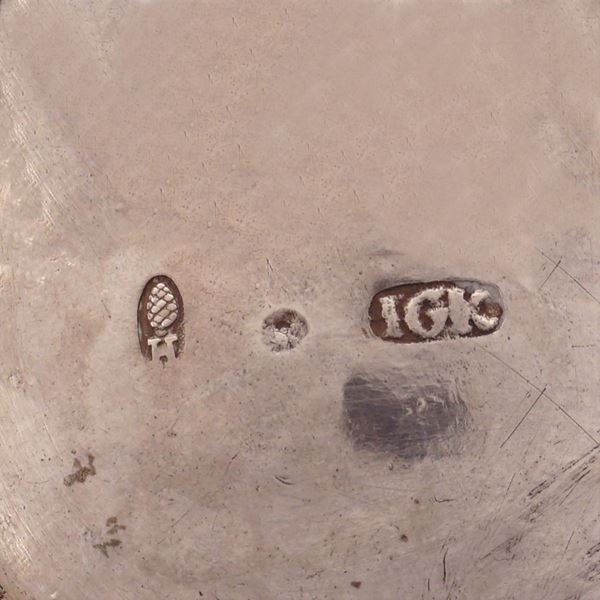 orafo Johann Georg Klose, corpo piriforme baccellato a torchon, presa del coperchio a foggia di fiore, manico sagomato in legno, h. 19 cm., peso 384 gr.