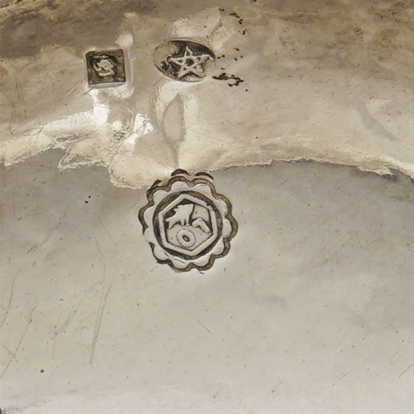 base ovale, coppetta sagomata poggiante su due grifoni alati, manici in legno tornito, 7x21 cm., peso 400 gr.