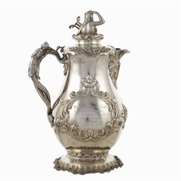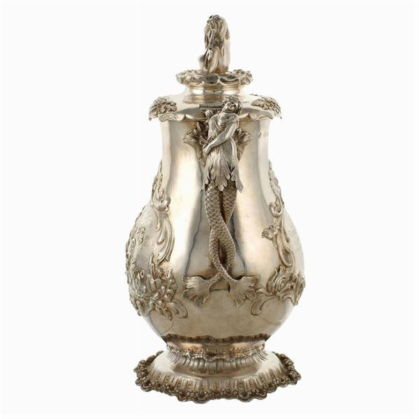 orafo George Angell, corpo piriforme sbalzato e cesellato con motivi di personaggi, grottesche e volute vegetali, manico e presa del coperchio a foggia di sirena, h. 36 cm., peso 1.567 gr.