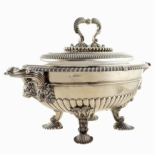 orafo Paul Storr, corpo di forma ovale baccellato centrato da uno stemma araldico, manici laterali e presa del coperchio cesellati con teste di leone e volute vegetali, poggiante su quattro piedini a riccio, 29x45x27 cm., peso 6.530 gr.