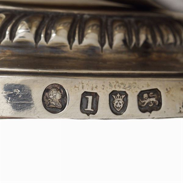 orafo Rebecca Emes & Edward Barnard I, corpo baccellato centrato da uno stemma araldico, profili godronati, manici di linea sagomata, vassoio con prese laterali a foggia di foglie d'acanto, 30x52x30 cm.