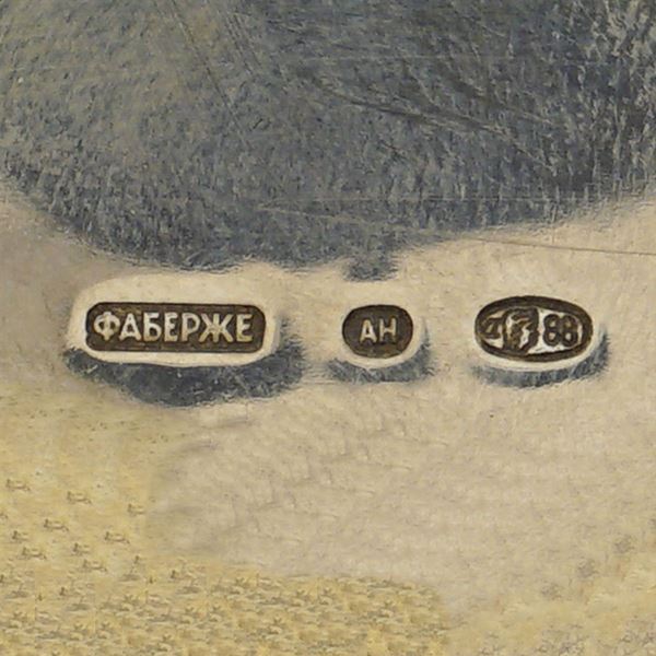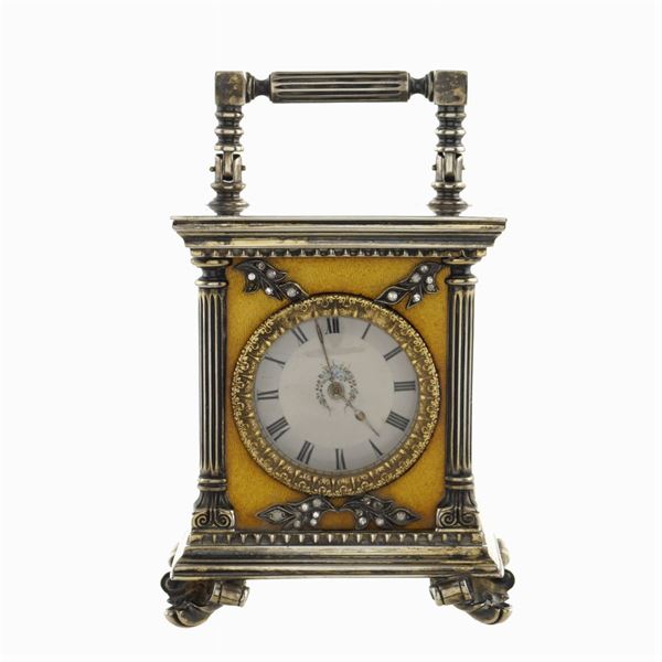 struttura architettonica poggiante su quattro piedini a voluta, superficie decorata in smalto guilloché nella tonalità del giallo, applicazioni in argento e rose di diamante a raffigurare motivi architettonici classici e motivi vegetali, sulle fasce laterali monogrammi entro riserve ovali, 7x5,5x4,5 cm.