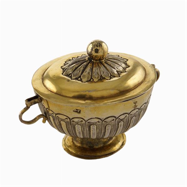 corpo baccellato e cesellato con motivi vegetali, manici di linea sagomata, presa del coperchio di forma sferica, 8x12x7 cm., peso 122 gr.