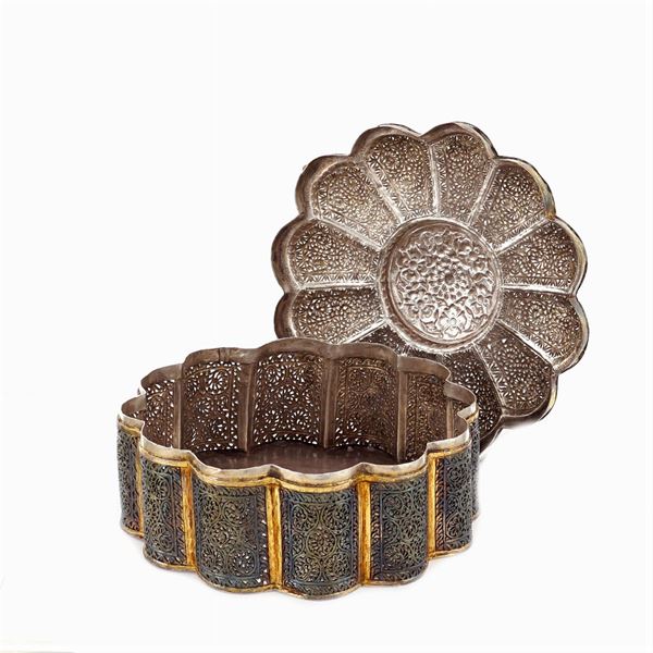 corpo sagomato e baccellato, cesellato e traforato con ricche volute vegetali, usure sulla doratura, 9,5x17,5 cm., peso 494 gr.