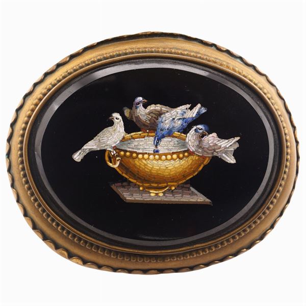 sezione ovale poggiante su quattro piedini, decorata con motivi floreali in smalti policromi, sul coperchio una placca in micromosaico raffigurante Le Colombe di Plinio su cassina in marmo nero del Belgio, all’interno reca l’iscrizione “C. Roccheggiani - Roma", 5,5x10x8 cm.