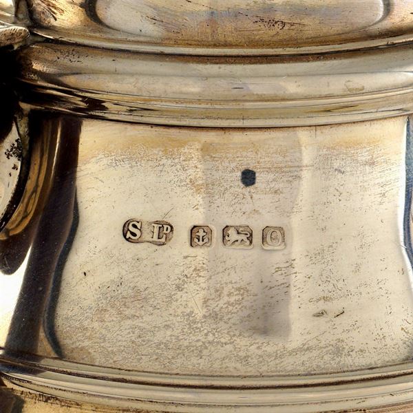orafo William Suckling Ltd, composto da una teiera, una zuccheriera e una lattiera, corpi lisci con profili godronati, teiera con manico e presa del coperchio in bachelite, lievi difetti, zuccheriera e lattiera con prese laterali di linea sagomata h. massima16,5 cm., peso 795 gr.