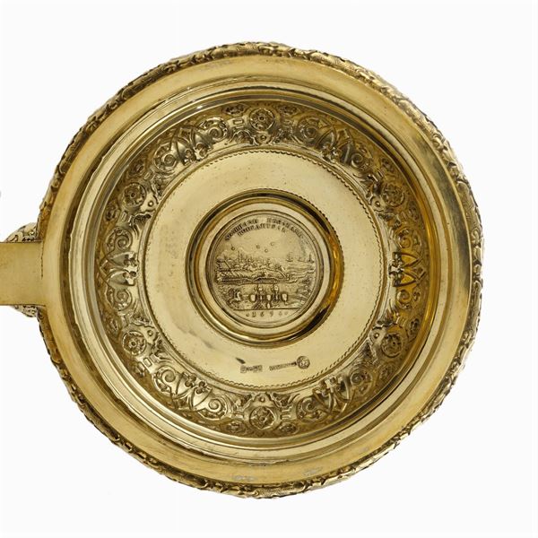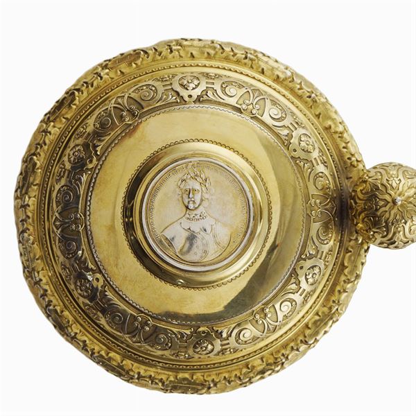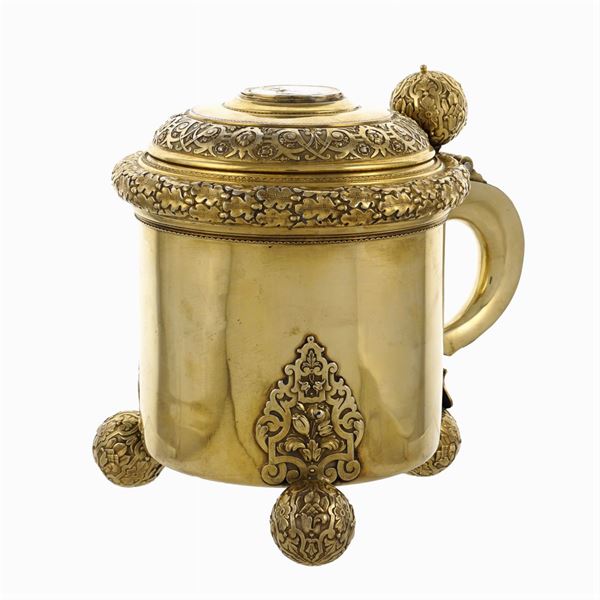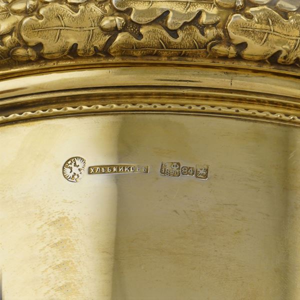 orafo Ivan Petrovich Khlebnikov, corpo liscio con elementi cesellati con motivi vegetali, floreali e di volute, poggiante su tre piedini sferici, coperchio centrato da una moneta russa del 1696 con iscrizioni in cirillico, h. 21,5 cm., peso 1.130 gr.