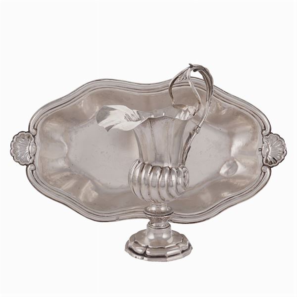 (periodo occupazione francese). Versatoio poggiante su base sagomata, corpo baccellato, manico a doppia voluta, h. 24 cm. bacile a sezione ovale con profilo sagomato e anse a foggia di conchiglia, 5x39,5x21 cm., peso 1.050 gr.