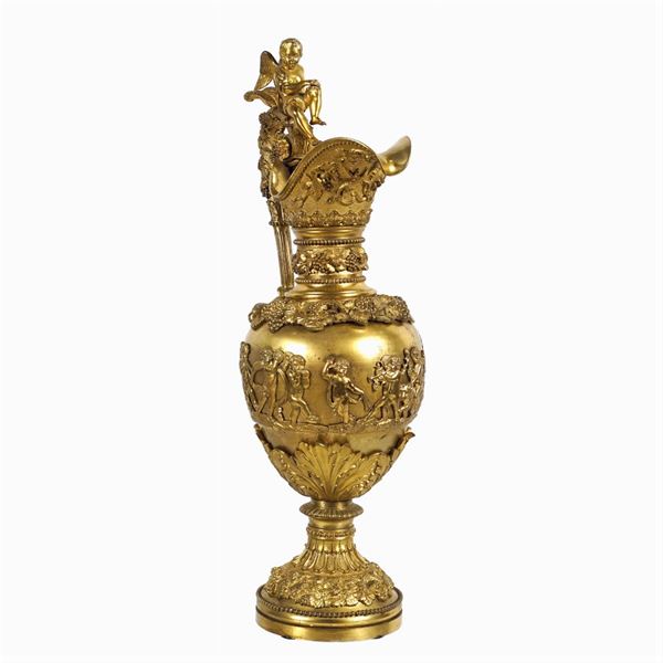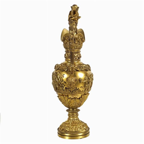 corpi cesellati con scena di baccanale, ricchi tralci di vite e altri motivi vegetali, manici di linea sagomata sormontati da figure di putti alati, h. 57 cm.