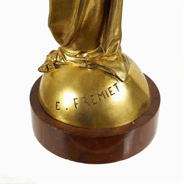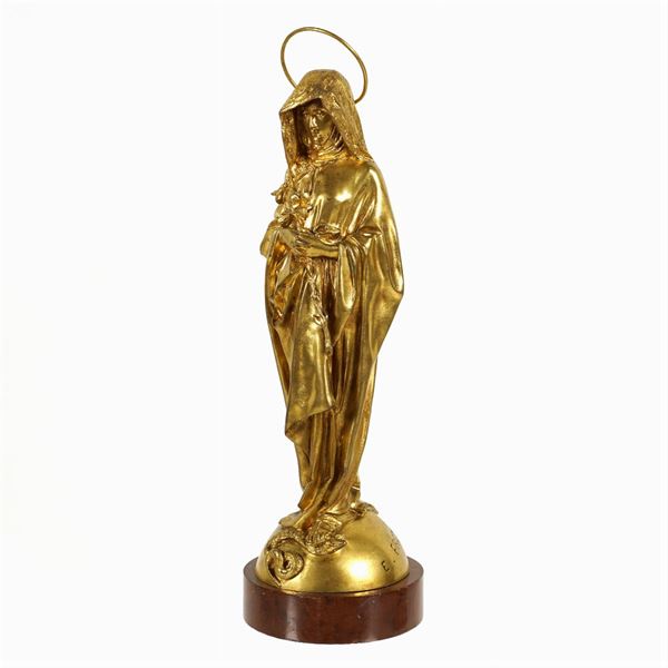 "Madonna del Giglio", scultura in bronzo dorato poggiante su base circolare in marmo rosso, firmata "E. Fremiet" alla base, h. 37 cm.
