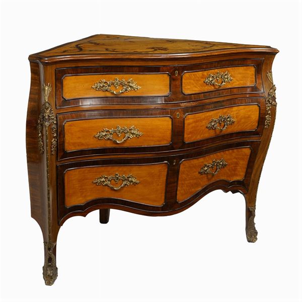 strutture in acero ed ebano viola, piani intarsiato con motivi vegetali, fronti a tre cassetti, applicazioni e maniglie in bronzo dorato e cesellato, lievi mancanze, 123x73x92 cm.
