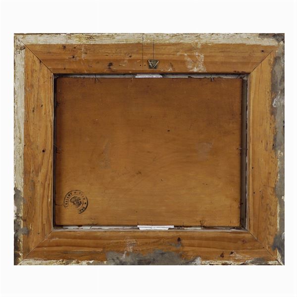 "Natura morta con scena di battaglia sullo sfondo", olio su tavola, firmato in alto a sinistra, entro cornice in legno dorato, 20x26 cm.