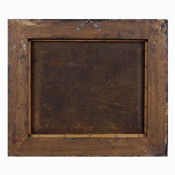 "Paesaggio con mulino a vento e personaggi", olio su tavola, entro cornice