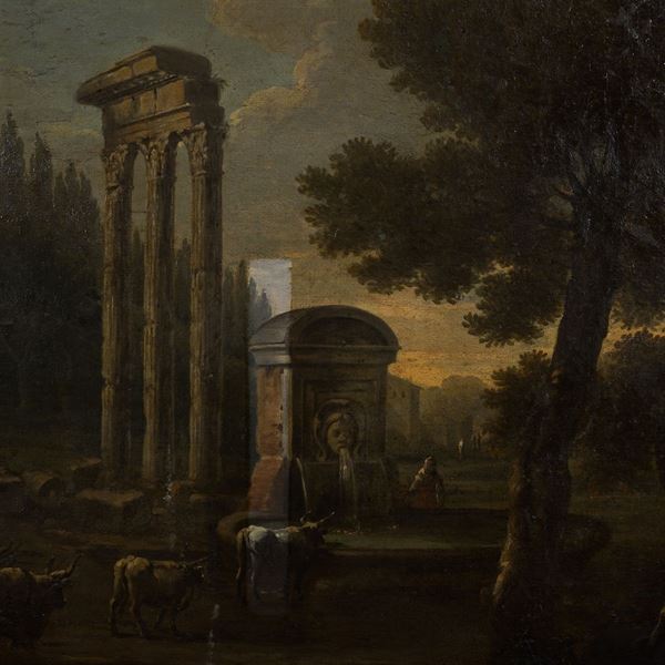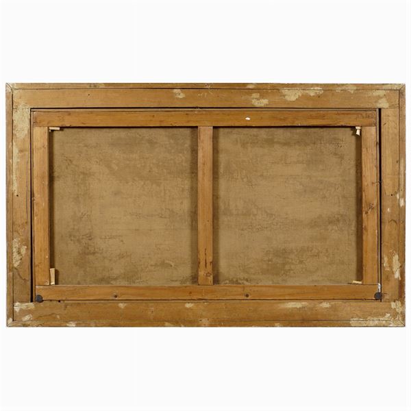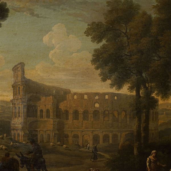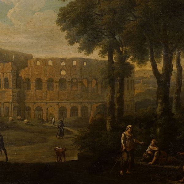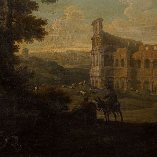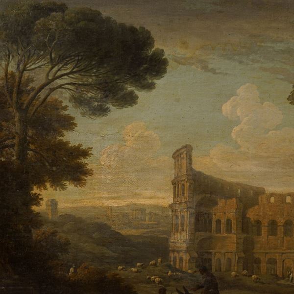 "Veduta del Colosseo" - "Veduta del colle Aventino", coppia di oli su tela, entro cornici coeve Salvator Rosa a tre ordini di intaglio in legno dorato, 74x136 cm.