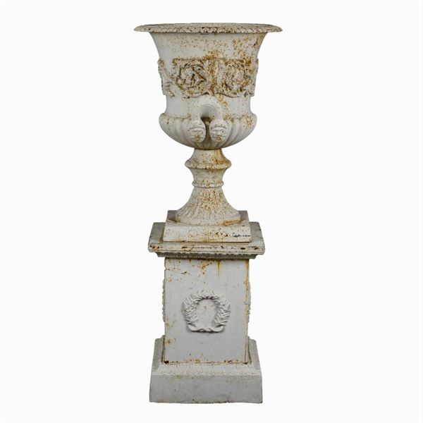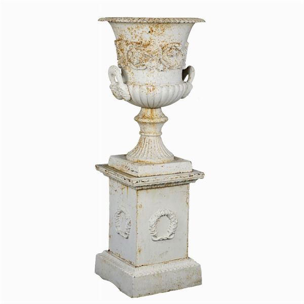 corpi verniciati bianchi, baccellati e decorati con motivi vegetali e di volute, ai lati coppie di teste di satiro da cui partono le anse, poggianti su basi squadrate, lievi usure, 141x43x43 cm.