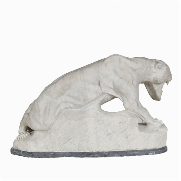 raffigurante "Una pantera", poggiante su base in marmo grigio, 35x57x26 cm.