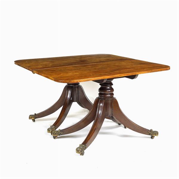 piano quadrato poggiante su due sostegni in legno tornito, piedi a sciabola con terminali in bronzo dorato provvisti di rotelle, completo di una prolunga da 72 cm., sedie con schienale traforato ed intagliato, sedute imbottite e rivestite in tessuto, lievi difetti, 71x124x124 (tavolo) e h. 92 cm. (sedie) cm.