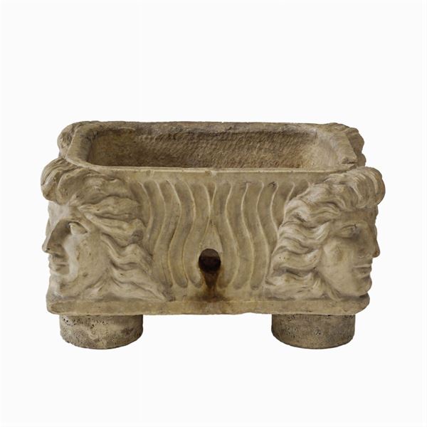 forma rettangolare, corpo baccellato e decorato con mascheroni ai lati, usure e alcune sbeccature, 30x54x38 cm.