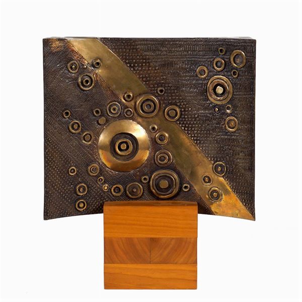 "Senza titolo", 2004, scultura in bronzo dorato e brunito con base in legno, marchio e data in alto a sinistra