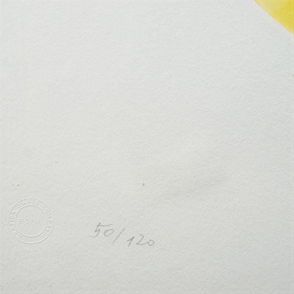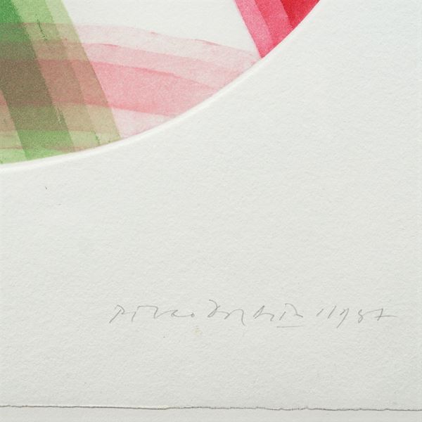 "Ovale 2", 1987, acquaforte a colori, es. 50/120, firma e data in basso a destra, tiratura e timbro a secco Grafica d'arte Lombardi, Roma in basso a sinistra, entro cornice, 76x58 cm.