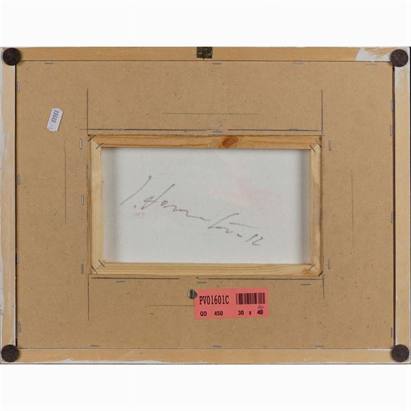 "Teatrini", 2012, olio su tela, firma in basso al centro e sul retro, entro cornice, autentica dell'artista su fotografia, 30x20 cm.
