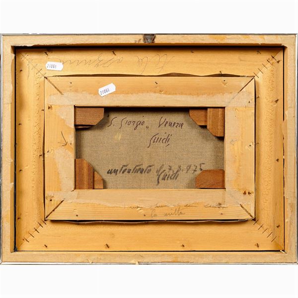 "San Giorgio, Venezia", 1975, olio su tela, firma in basso a destra, per autentica, firma e titolo sul retro in data 7.3.975, entro cornice, 20x30,5 cm.