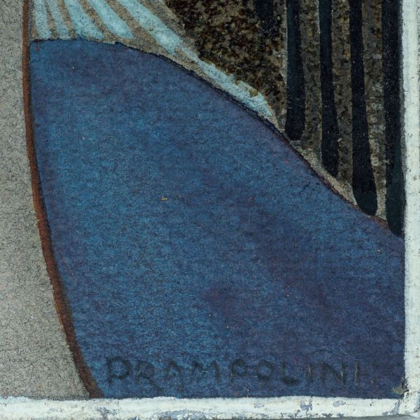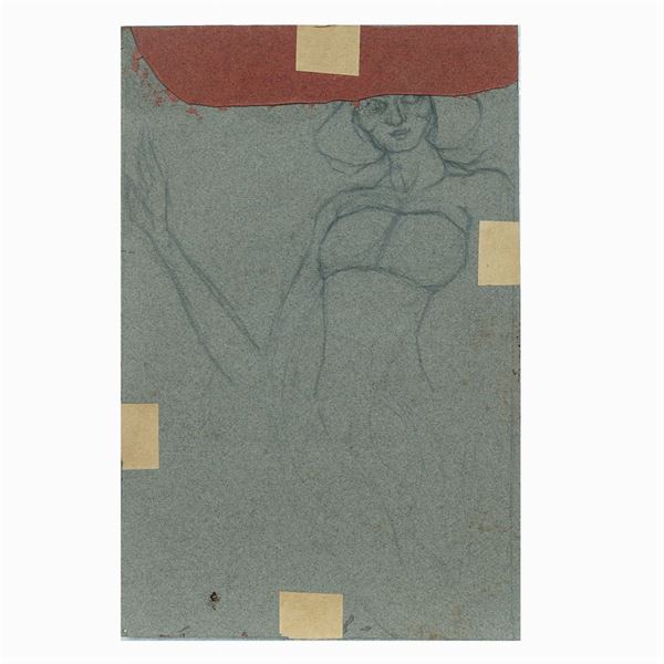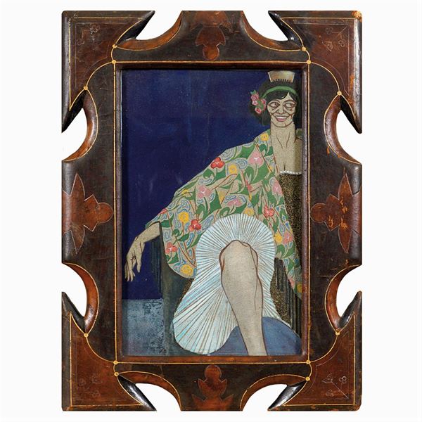 "Figura femminile in veste floreale", 1915 circa, tecnica mista su carta, firmato in basso a destra, entro cornice sagomata in cuoio stampato e dipinto. Bibliografia: "Le arti minori d'autore in Italia dal 1900 al 1930", I. de Guttry, M. P. Maino, M. Quesada, Editori Laterza, Bari 1985, n. 50, 30,5x19,5 cm.