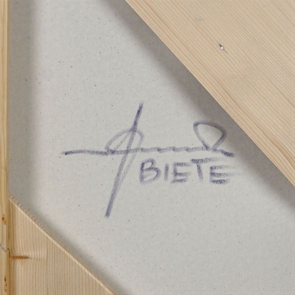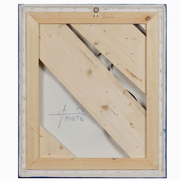 "BIETE - Blù", acrilico su tela estroflessa, firmata e titolata sul retro, autentica dell'artista su fotografia, 50x60 cm.