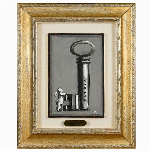 "Per aprire le porte dell'avvenire", illustrazione per " La Rivista Illustrata del Popolo d'Italia", anno VII, n. 1 gennaio 1929, pag. 9, 1929, tempera, china e matita grassa su carta applicata su tela, firmata in basso a destra, datata in basso a sinistra, entro cornice. Opera archiviata dall' Associzione per il Patrocinio e la Promozione della Figura e dell'Opera di Mario Sironi, Milano, con il n. 102/18 RA, come da certificato in data 2 luglio 2018 Provenienza: collezione privata, Roma Bibliografia: “Sironi Illustratore, Catalogo Ragionato” a cura di Fabio Benzi e Andrea Sironi, Edizioni De Luca, 1988, n.1540, p.161, 36x23,6 cm.
